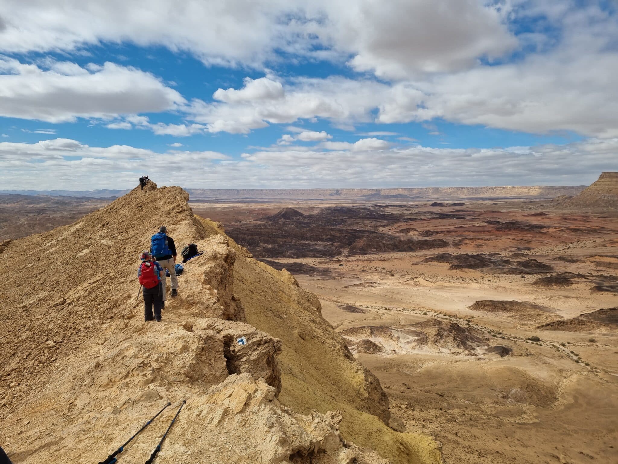 ביום הראשון לטיול נתחיל באיסוף המטיילים מציר הנסיעה הראשי. נגיע למכתש רמון ונתחיל את המסע מרמת סהרונים. נלך דרך כרבולת חרירים ונגיע אל נחל מעוק, ממנו נמשיך דרך נחל גלד ואולי אף נזכה לראות את עין גלד מלא במים. נסיים באחד מחניוני הלילה הנדחים ביותר בארץ, סמוך לגב חולית. ביום זה נלך באחד המקטעים הכי יפים של שביל ישראל כאשר פה ושם ״נתבל״ את המסלול בכמה שבילים פחות מוכרים.